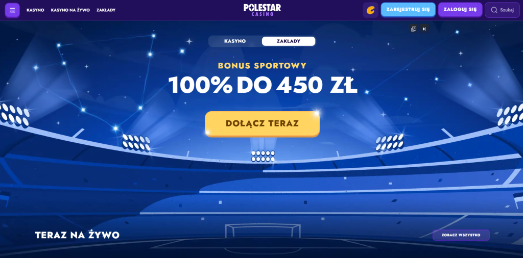 - PolestarCasino – rozbudowana sekcja sportowa z bonusem powitalnym 100% do 500 PLN. Podwyższone kursy, zestawy wzmocnione do 100%, program zwrotów 10% do 2250 PLN. Bonusy specjalistyczne: wyścigi konne 50% do 225 PLN, zakłady e-sportowe 50% do 225 PLN, wirtualna FIFA 25% do 225 PLN. Obsługa kryptowalut i kompletna polska lokalizacja.